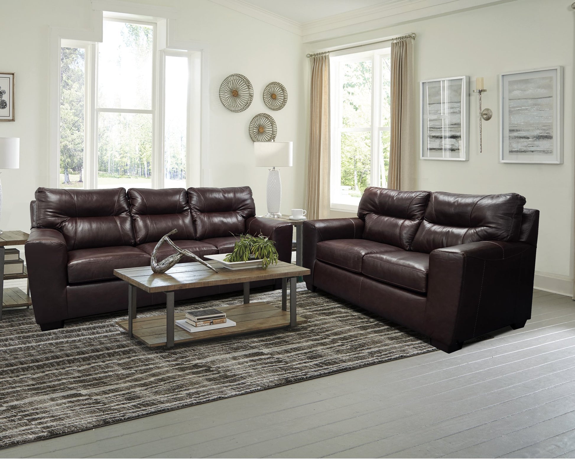 Leather sofa and loveseat in a rich chocolate color with buttonless tufted back cushions and visible stitching.