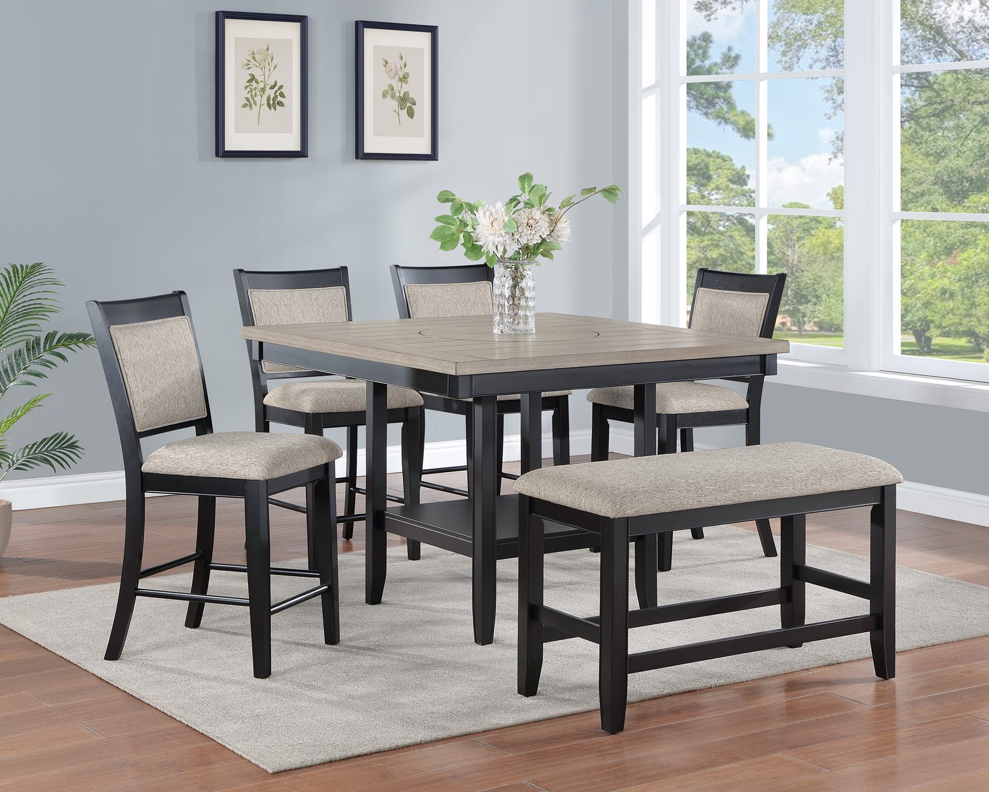 Counter height table with Chairs, optional bench and a lazy Susan.
