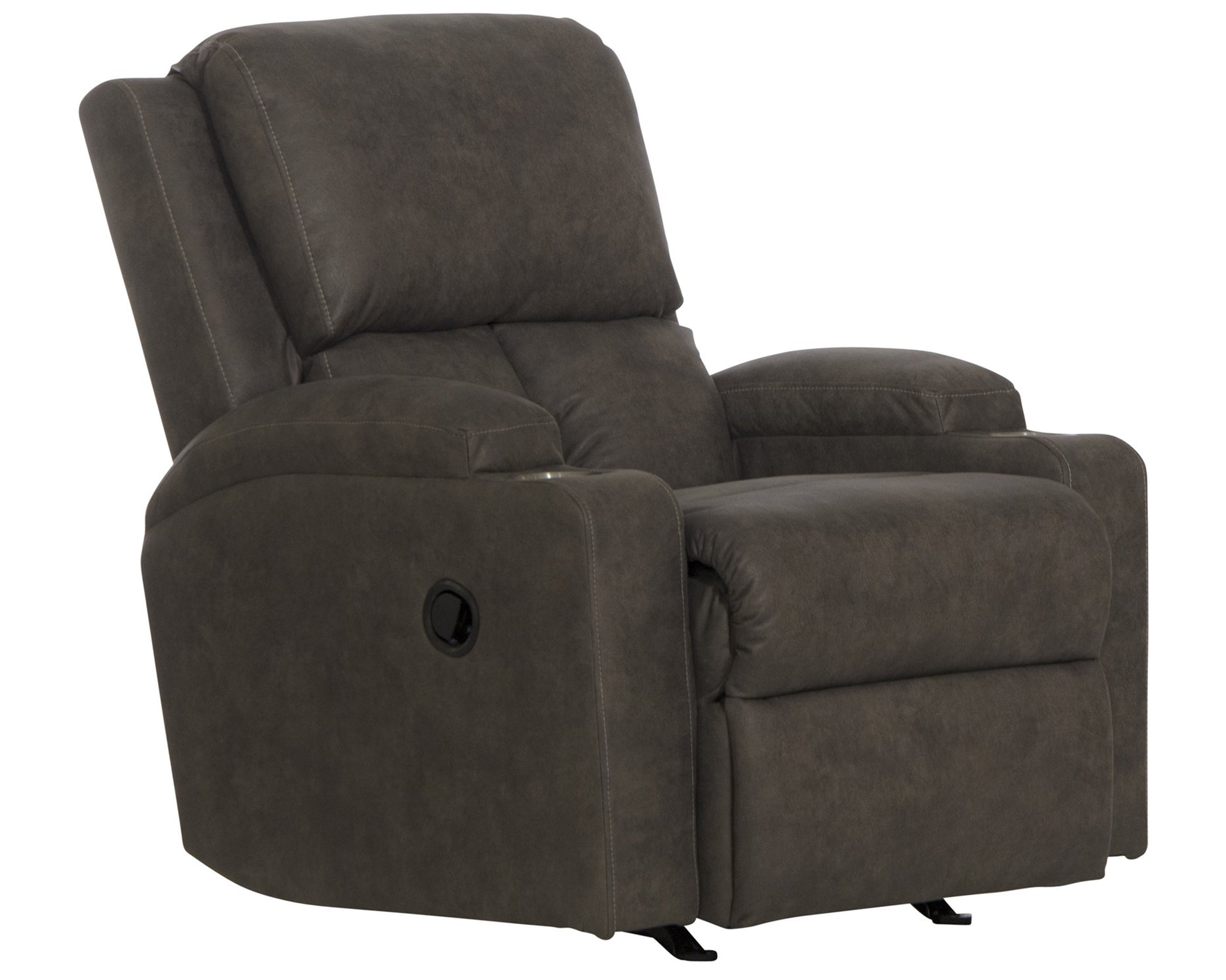 Soft printed polyester fabric covering recliners with dual cupholders. Pub back lumbar support and comfort coil seating are included with this rocker/recliner.