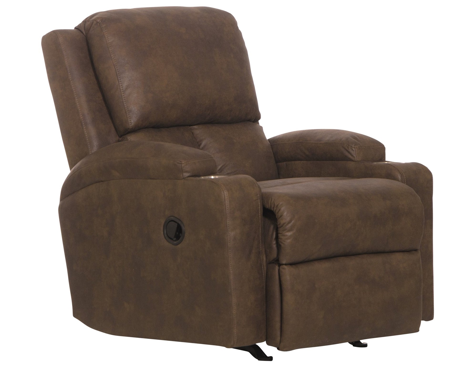 Soft printed polyester fabric covering recliners with dual cupholders. Pub back lumbar support and comfort coil seating are included with this rocker/recliner.