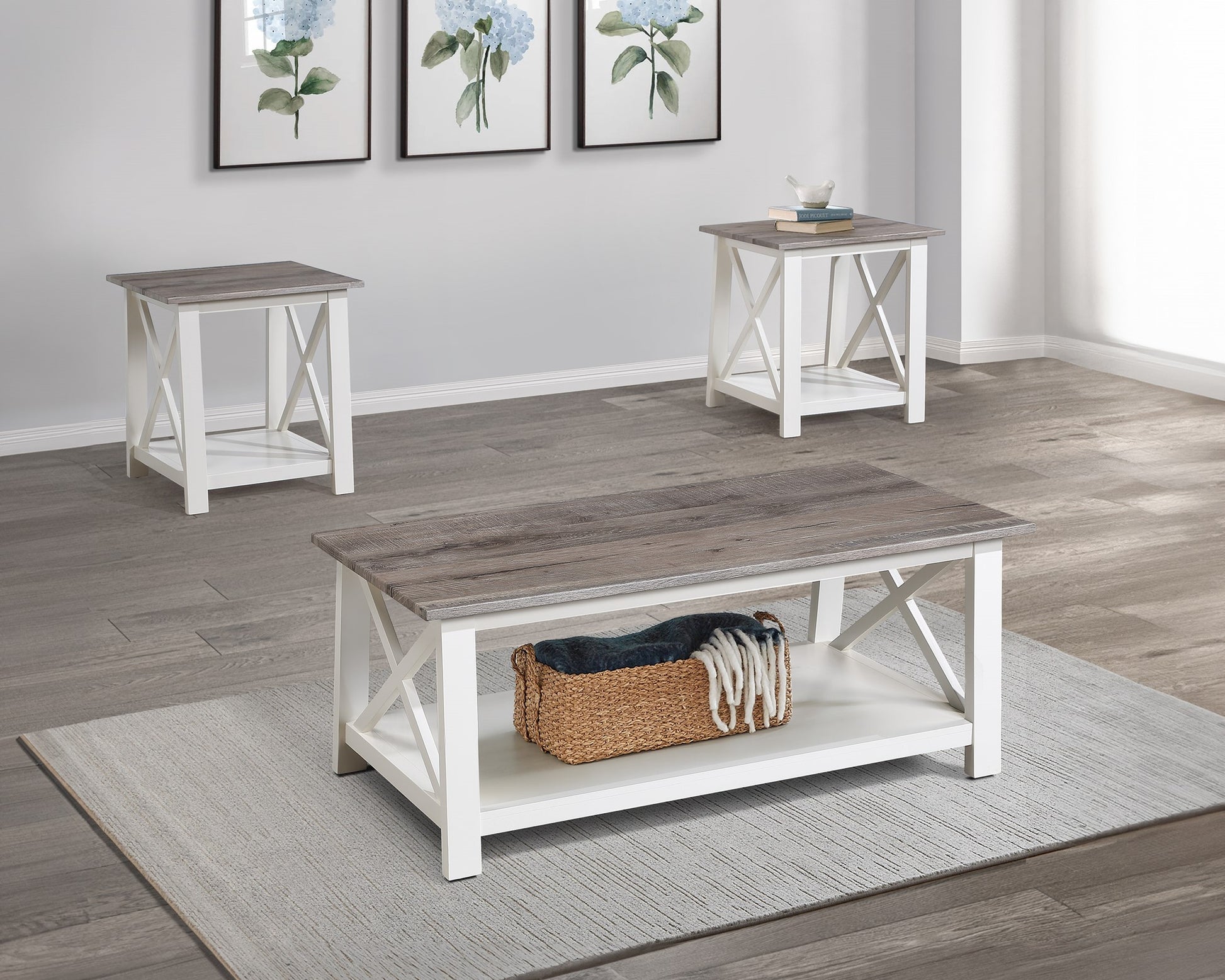 Grey over white two tone accent coffee and end tables with a farmhouse style decor.