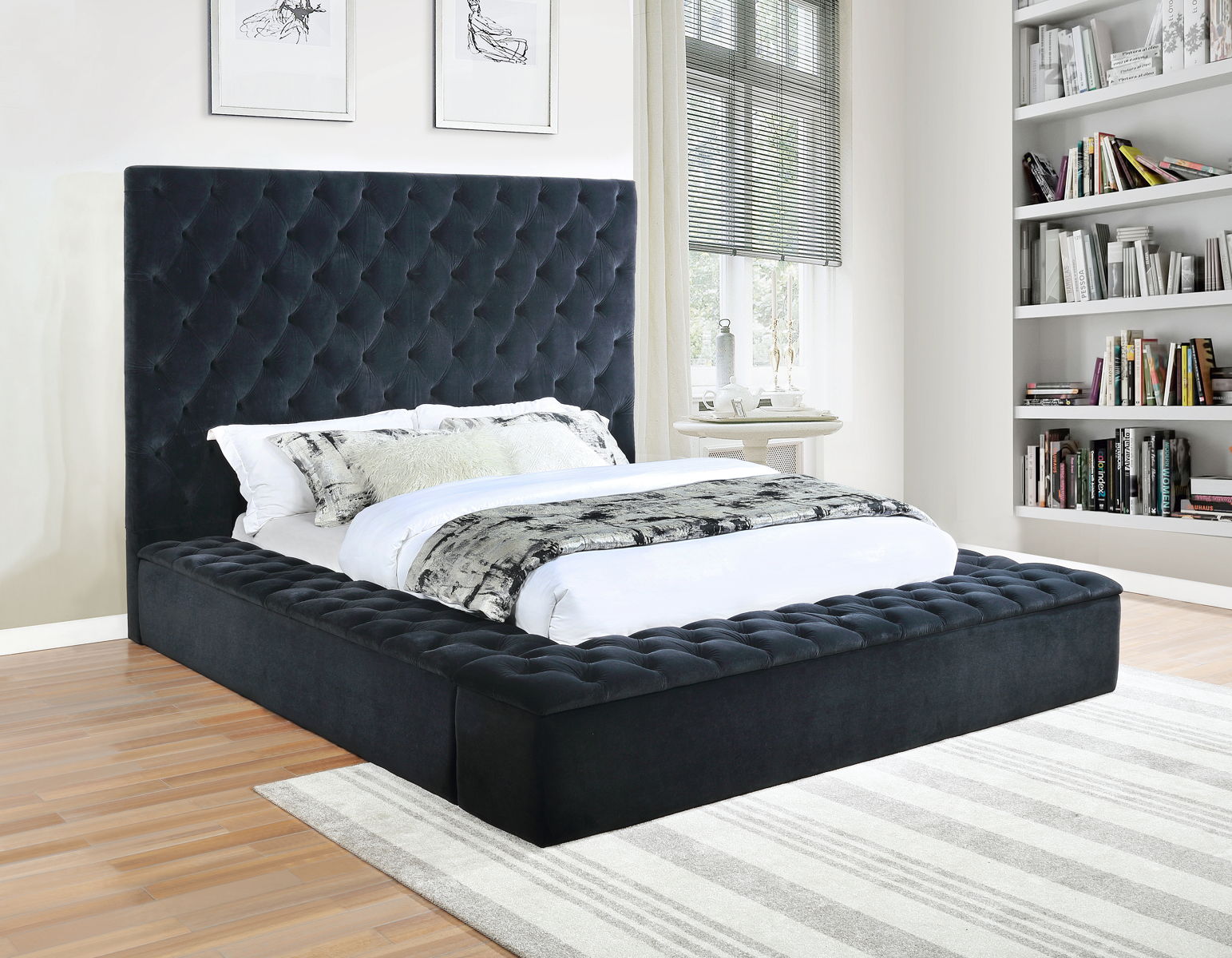 Square multi storage platform bed upholstered in fabric, button tufted, 13 slats