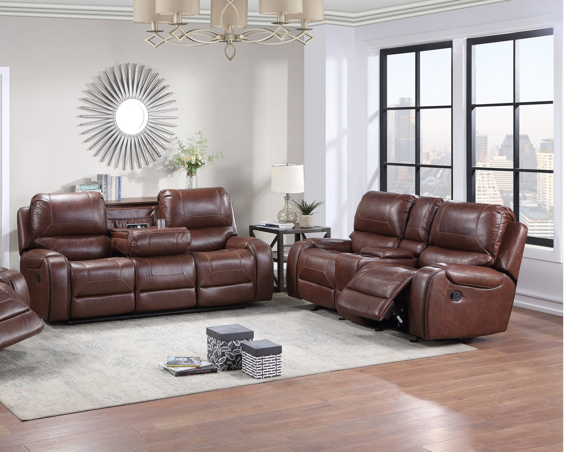 Manual Motion Reclining Sofa w/Drop Down Table, console with slow-release pop-up, USB charging station, electrical outlets, cupholders, Brown