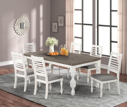 - Wood table with white finish and Grey top, Grey fabric upholstered seats.
